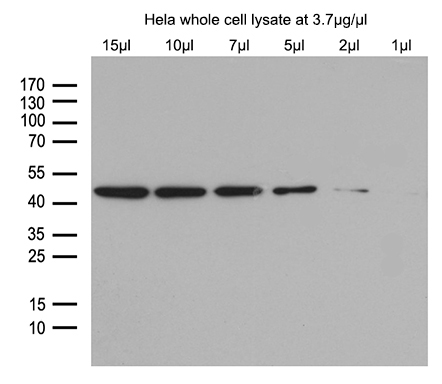 Western blot analysis of anti-Beta Actin/ACTB antibody (BA2305). The sample well of each lane was loaded with 30 ug of sample under reducing conditions.