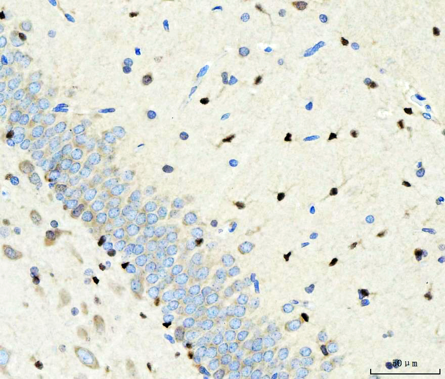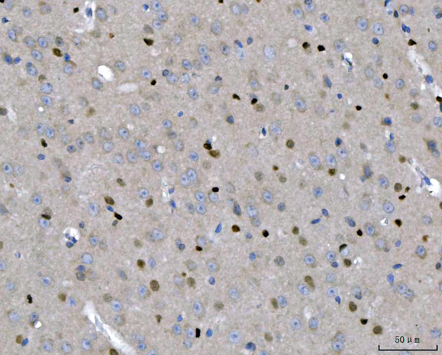 SOX2 was detected in a paraffin-embedded section of mouse brain tissue. Biotinylated goat anti-rabbit IgG was used as secondary antibody. The tissue section was incubated with rabbit anti-SOX2 Antibody (BA3292) at a dilution of 1:200 and developed using Strepavidin-Biotin-Complex (SABC) (Catalog # SA1022) with DAB (Catalog # AR1027) as the chromogen.