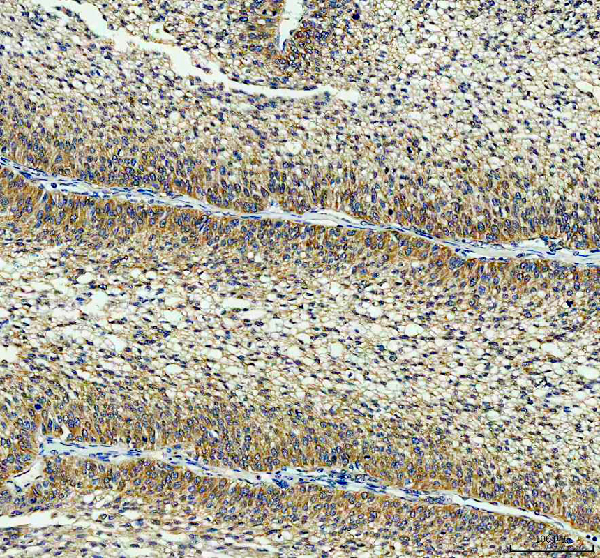 ATG5 was detected in a paraffin-embedded section of human ovarian cancer tissue. The tissue section was incubated with rabbit anti-ATG5 Antibody (BA3525-2) at a dilution of 1:200 and developed using HRP Conjugated Rabbit IgG Super Vision Assay Kit (Catalog # SV0002) with DAB (Catalog # AR1027) as the chromogen.