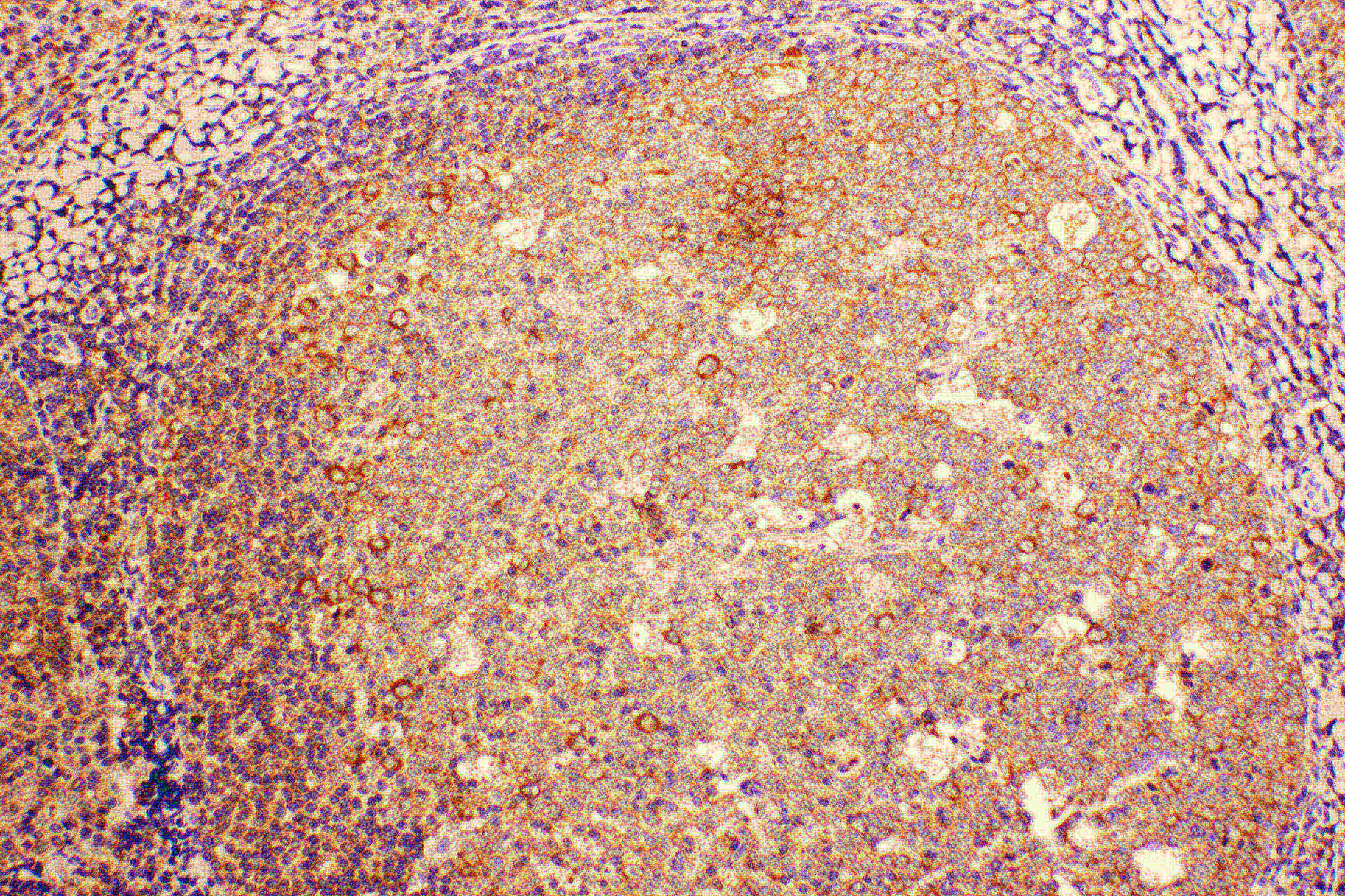 CD68 was detected in a paraffin-embedded section of human tonsil tissue. The tissue section was incubated with rabbit anti-CD68 Antibody (BA3639) at a dilution of 1:200 and developed using HRP Conjugated Rabbit IgG Super Vision Assay Kit (Catalog # SV0002) with DAB (Catalog # AR1027) as the chromogen.