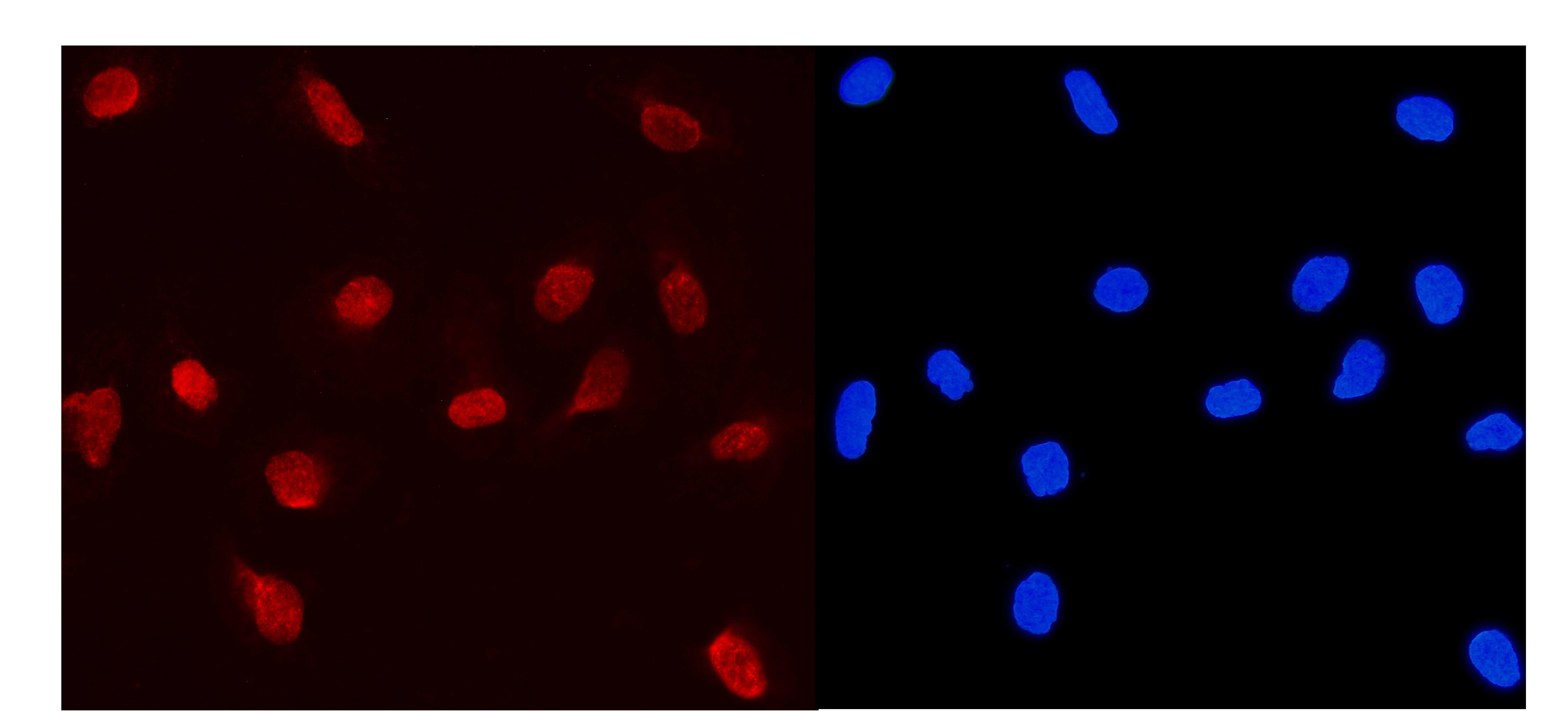 MCM5 was detected in an immunocytochemical section of U2OS cells. The section was incubated with rabbit anti-MCM5 Antibody (BA3685) at a dilution of 1:100. Fluoro594-conjugated Anti-rabbit IgG Secondary Antibody (red)(Catalog#BA1142) was used as secondary antibody. The section was counterstained with DAPI (Catalog # AR1176) (Blue).