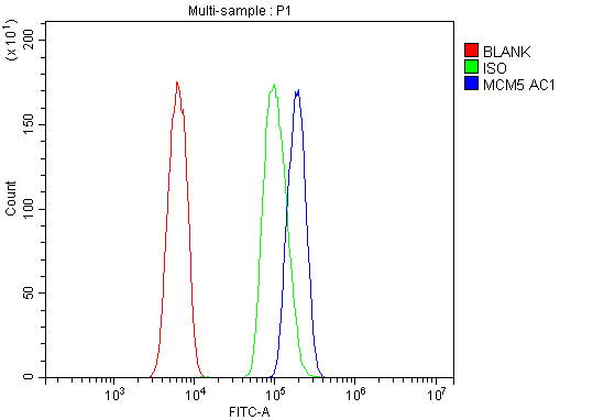 Overlay histogram showing HL-60 cells stained with BA3685 (Blue line). To facilitate intracellular staining, cells were fixed with 4% paraformaldehyde and permeabilized with permeabilization buffer. The cells were blocked with 10% normal goat serum. And then incubated with rabbit anti-MCM5 Antibody (BA3685) at 1:100 dilution for 30 min at 20°C. Fluoro488 conjugated goat anti-rabbit IgG (BA1127) was used as secondary antibody at 1:100 dilution for 30 minutes at 20°C. Isotype control antibody (Green line) was rabbit IgG at 1:100 dilution used under the same conditions. Unlabelled sample without incubation with primary antibody and secondary antibody (Red line) was used as a blank control.