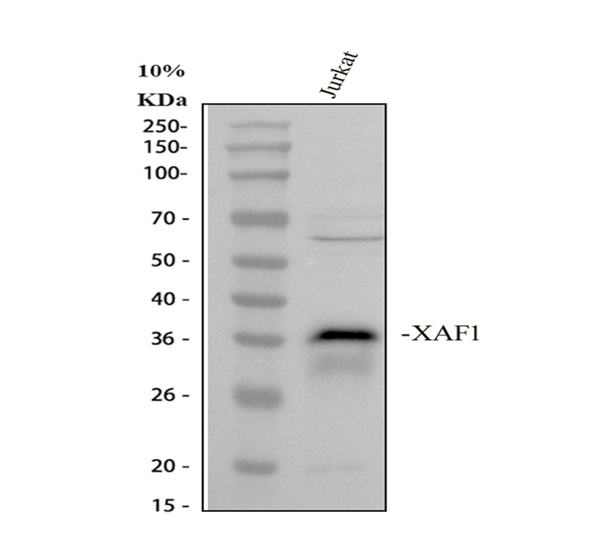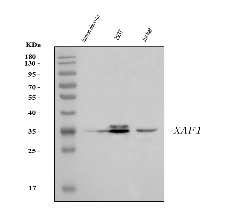 Western blot analysis of XAF1 using anti-XAF1 antibody (BA4986). The sample well of each lane was loaded with 30 ug of sample under reducing conditions.