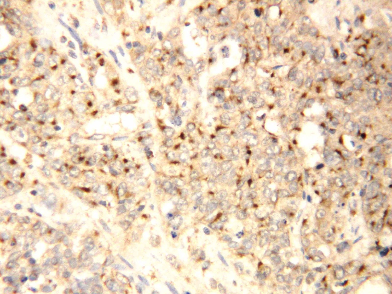 XAF1 was detected in a paraffin-embedded section of human endometrial cancer tissue. Biotinylated goat anti-rabbit IgG was used as secondary antibody. The tissue section was incubated with rabbit anti-XAF1 Antibody (BA4986) at a dilution of 1:200 and developed using Strepavidin-Biotin-Complex (SABC) (Catalog # SA1022) with DAB (Catalog # AR1027) as the chromogen.