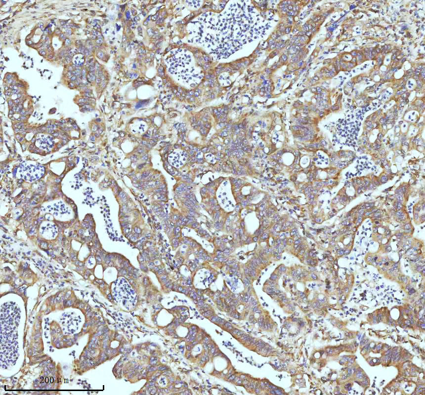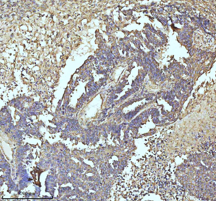 beta I Tubulin/TUBB1 was detected in a paraffin-embedded section of human rectum adenocarcinoma tissue. The tissue section was incubated with rabbit anti-beta I Tubulin/TUBB1 Antibody (BM3878) at a dilution of 1:200 and developed using HRP Conjugated Rabbit IgG Super Vision Assay Kit (Catalog # SV0002) with DAB (Catalog # AR1027) as the chromogen.