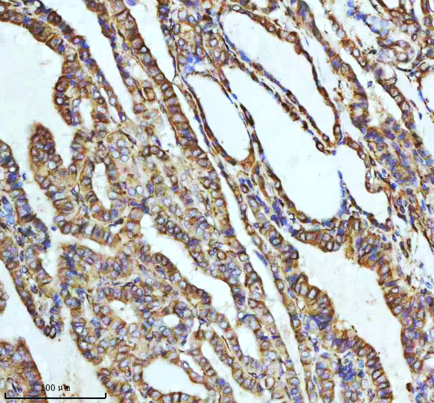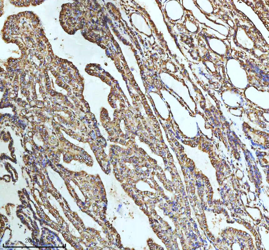 beta I Tubulin/TUBB1 was detected in a paraffin-embedded section of human thyroid papillary carcinoma tissue. The tissue section was incubated with rabbit anti-beta I Tubulin/TUBB1 Antibody (BM3878) at a dilution of 1:200 and developed using HRP Conjugated Rabbit IgG Super Vision Assay Kit (Catalog # SV0002) with DAB (Catalog # AR1027) as the chromogen.