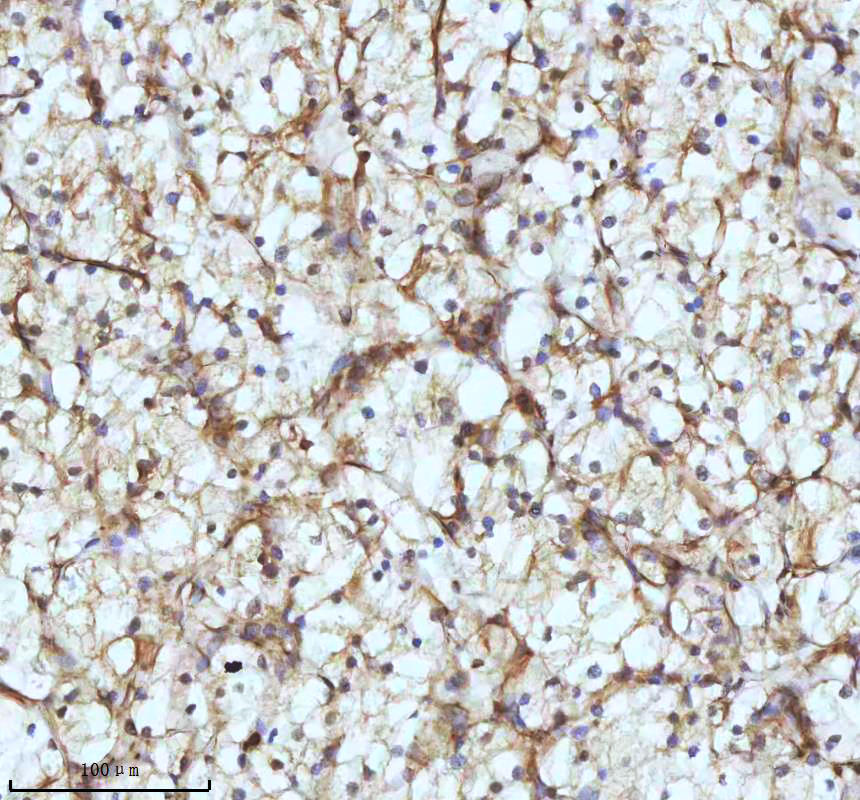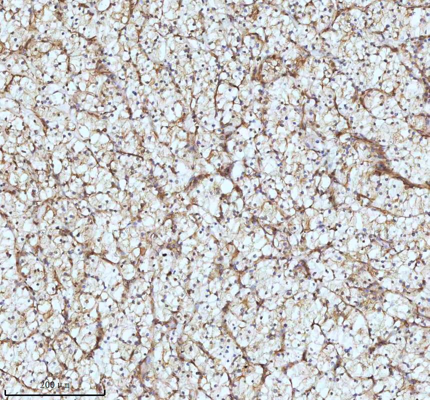 beta I Tubulin/TUBB1 was detected in a paraffin-embedded section of human clear cell renal cell carcinoma tissue. The tissue section was incubated with rabbit anti-beta I Tubulin/TUBB1 Antibody (BM3878) at a dilution of 1:200 and developed using HRP Conjugated Rabbit IgG Super Vision Assay Kit (Catalog # SV0002) with DAB (Catalog # AR1027) as the chromogen.