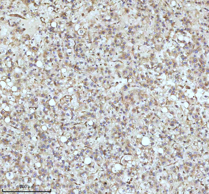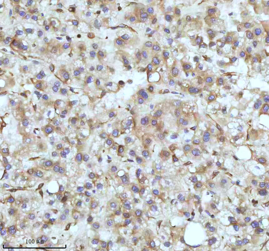 beta I Tubulin/TUBB1 was detected in a paraffin-embedded section of human liver cancer tissue. The tissue section was incubated with rabbit anti-beta I Tubulin/TUBB1 Antibody (BM3878) at a dilution of 1:200 and developed using HRP Conjugated Rabbit IgG Super Vision Assay Kit (Catalog # SV0002) with DAB (Catalog # AR1027) as the chromogen.