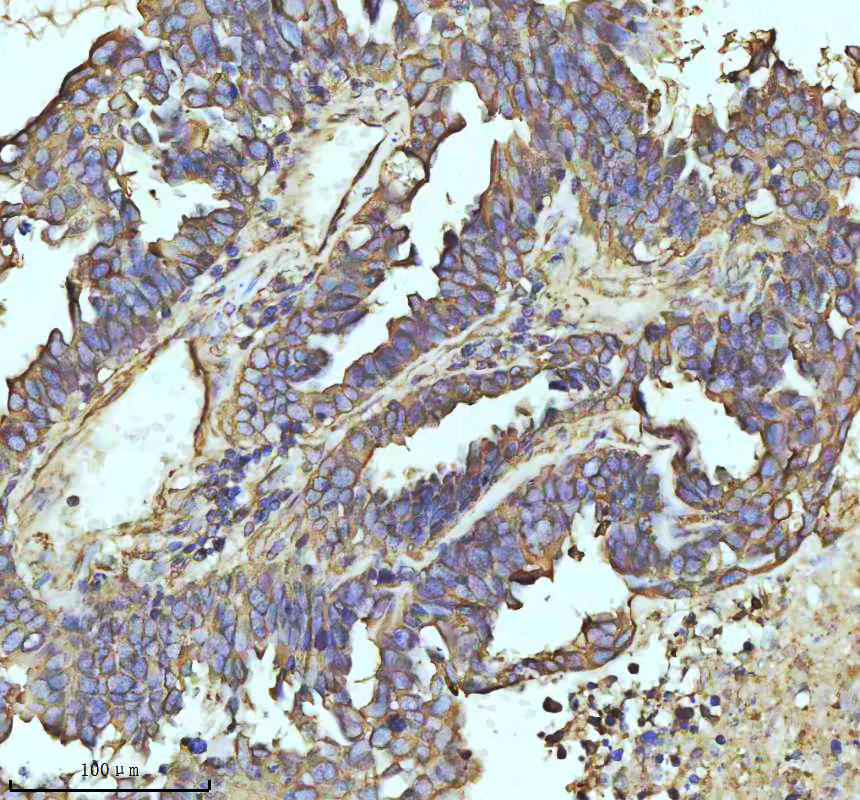 beta I Tubulin/TUBB1 was detected in a paraffin-embedded section of human ovarian cancer tissue. The tissue section was incubated with rabbit anti-beta I Tubulin/TUBB1 Antibody (BM3878) at a dilution of 1:200 and developed using HRP Conjugated Rabbit IgG Super Vision Assay Kit (Catalog # SV0002) with DAB (Catalog # AR1027) as the chromogen.