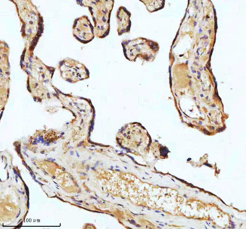 beta I Tubulin/TUBB1 was detected in a paraffin-embedded section of human placenta tissue. The tissue section was incubated with rabbit anti-beta I Tubulin/TUBB1 Antibody (BM3878) at a dilution of 1:200 and developed using HRP Conjugated Rabbit IgG Super Vision Assay Kit (Catalog # SV0002) with DAB (Catalog # AR1027) as the chromogen.