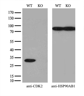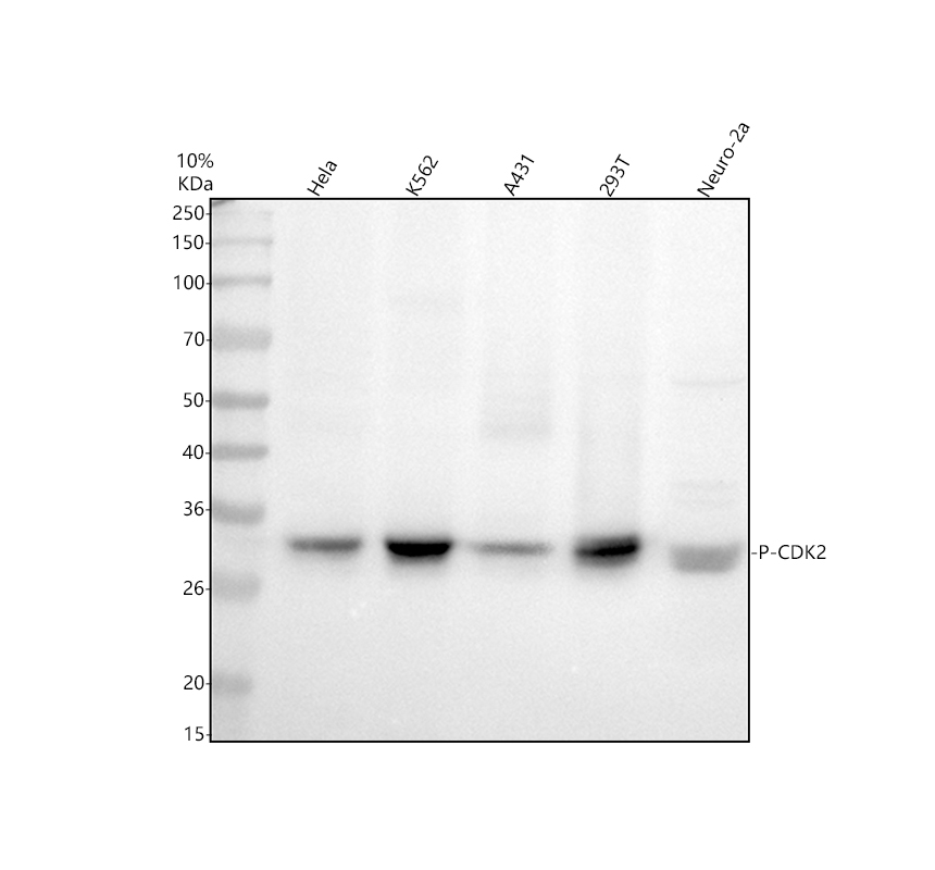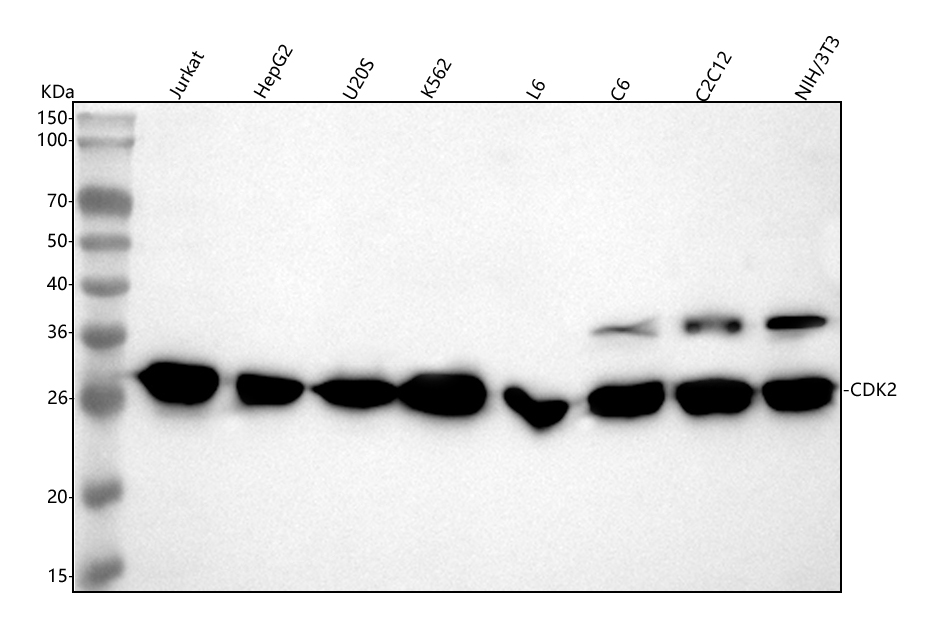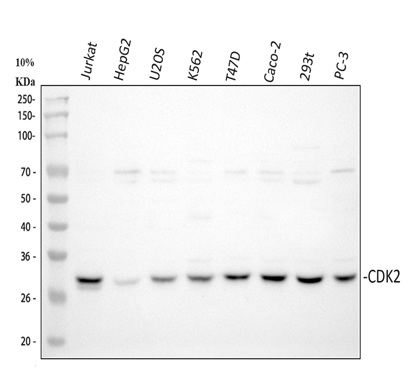 Western blot analysis of anti-CDK2 antibody (BM3926). The sample well of each lane was loaded with 30 ug of sample under reducing conditions.