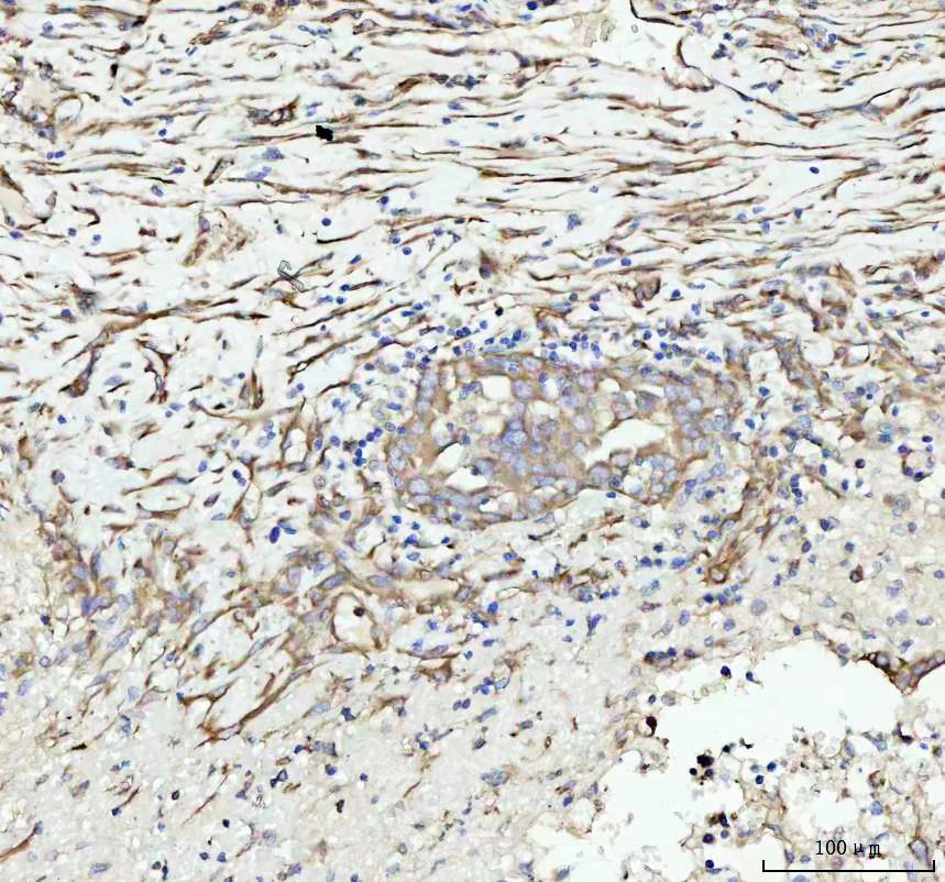 Vinculin/VCL was detected in a paraffin-embedded section of human renal cell carcinoma tissue. The tissue section was incubated with rabbit anti-Vinculin/VCL Antibody (BM4051) at a dilution of 1:200 and developed using HRP Conjugated Rabbit IgG Super Vision Assay Kit (Catalog # SV0002) with DAB (Catalog # AR1027) as the chromogen.