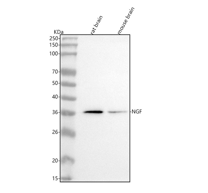 After electrophoresis, proteins were transferred to a membrane. Then the membrane was incubated with rabbit anti-NGF beta/NGF antigen affinity purified monoclonal antibody (BM4100) at a dilution of 1:1000 and probed with a goat anti-rabbit IgG-HRP secondary antibody (Catalog # BA1054). The signal is developed using ECL Plus Western Blotting Substrate (Catalog # AR1197). A specific band was detected for NGF beta/NGF at approximately 35 kDa. The expected band size for NGF beta/NGF is at 27 kDa.