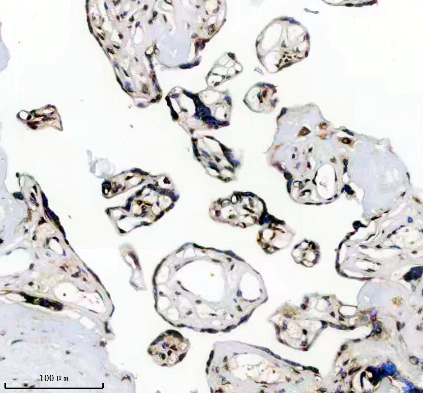 Histone H3 was detected in a paraffin-embedded section of human placenta tissue. The tissue section was incubated with rabbit anti-Histone H3 Antibody (BM4104) at a dilution of 1:200 and developed using HRP Conjugated Rabbit IgG Super Vision Assay Kit (Catalog # SV0002) with DAB (Catalog # AR1027) as the chromogen.