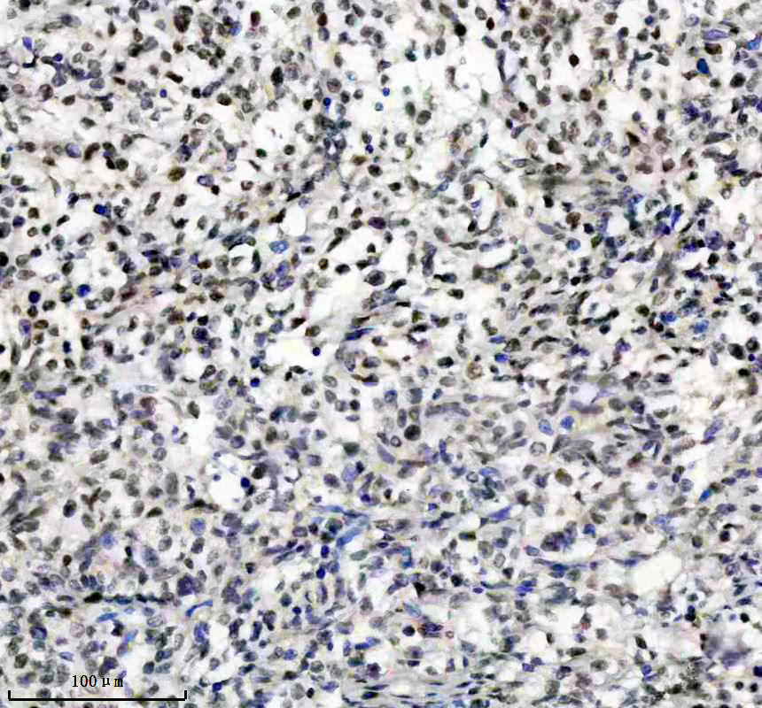 Histone H3 was detected in a paraffin-embedded section of human lymphoma tissue. The tissue section was incubated with rabbit anti-Histone H3 Antibody (BM4104) at a dilution of 1:200 and developed using HRP Conjugated Rabbit IgG Super Vision Assay Kit (Catalog # SV0002) with DAB (Catalog # AR1027) as the chromogen.
