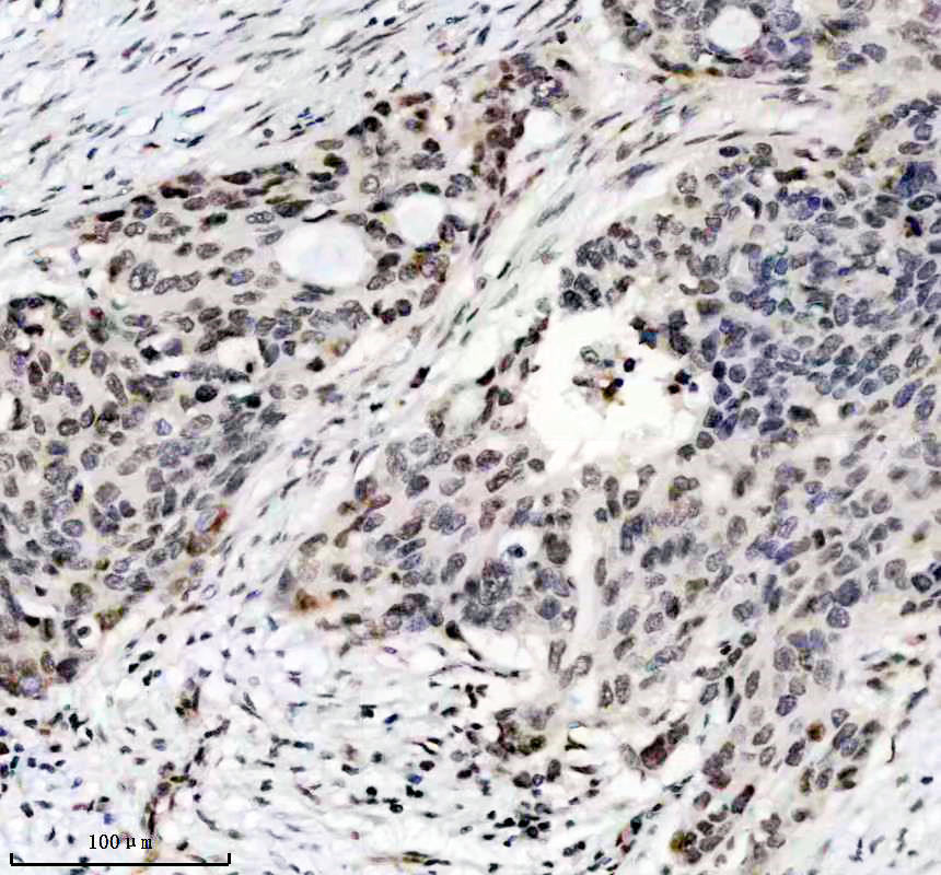 Histone H3 was detected in a paraffin-embedded section of human ovarian cancer tissue. The tissue section was incubated with rabbit anti-Histone H3 Antibody (BM4104) at a dilution of 1:200 and developed using HRP Conjugated Rabbit IgG Super Vision Assay Kit (Catalog # SV0002) with DAB (Catalog # AR1027) as the chromogen.