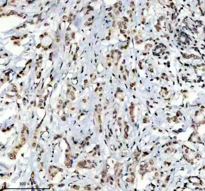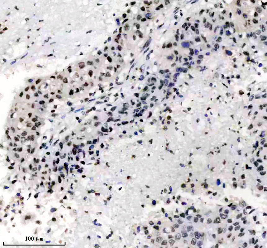 Histone H3 was detected in a paraffin-embedded section of human lung cancer tissue. The tissue section was incubated with rabbit anti-Histone H3 Antibody (BM4104) at a dilution of 1:200 and developed using HRP Conjugated Rabbit IgG Super Vision Assay Kit (Catalog # SV0002) with DAB (Catalog # AR1027) as the chromogen.