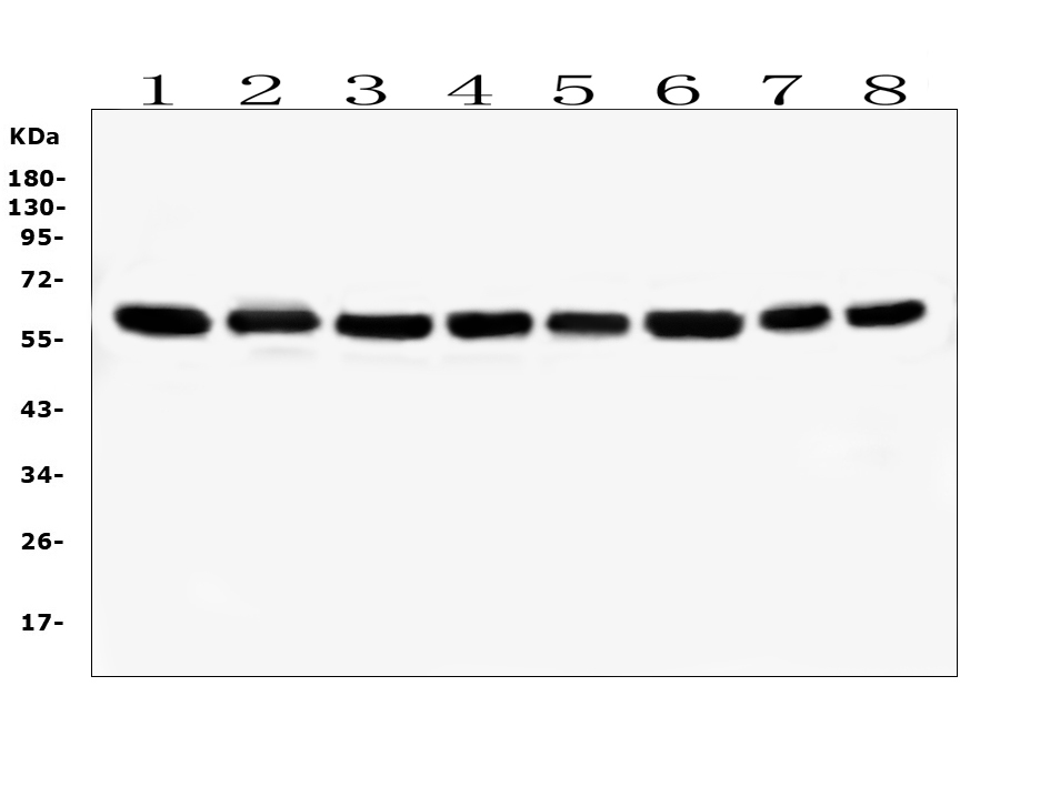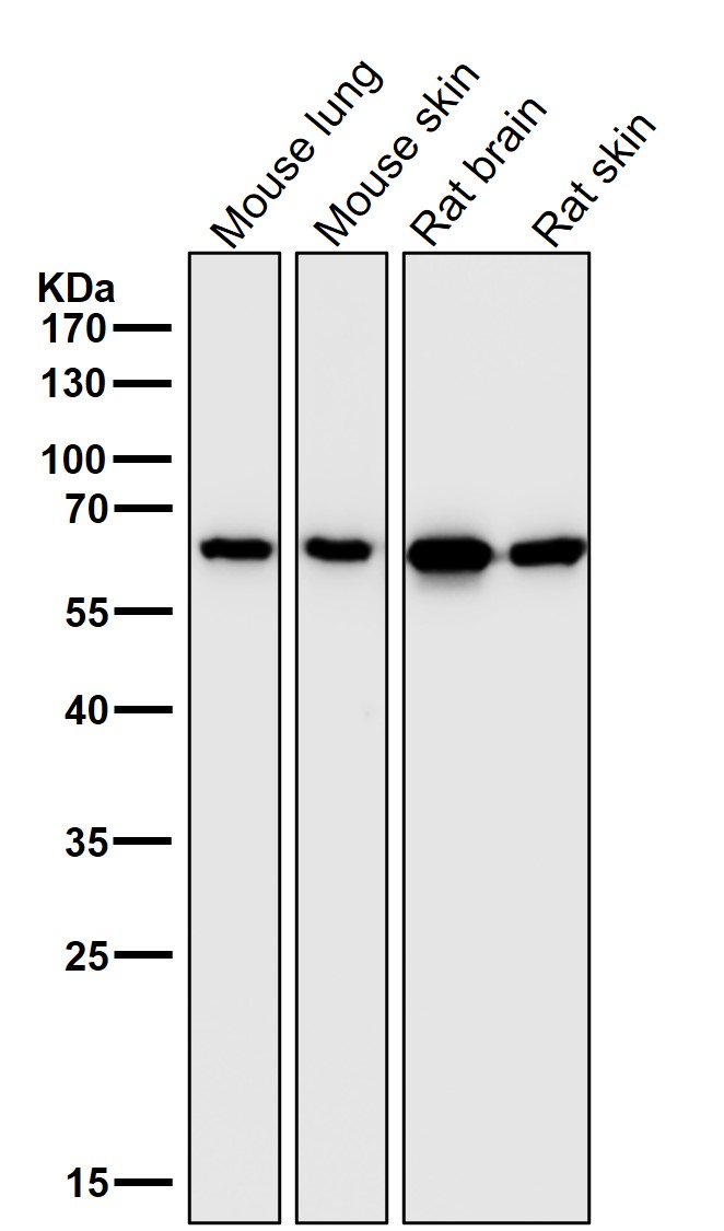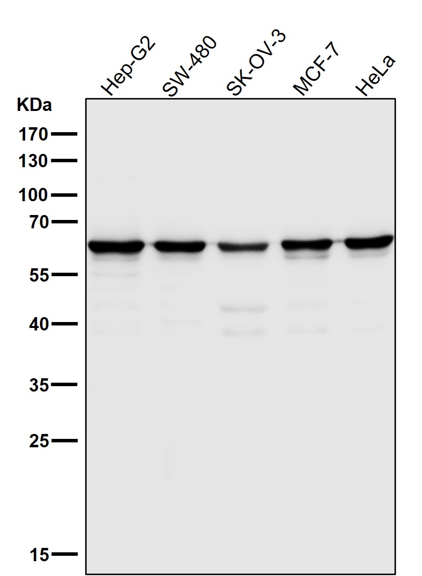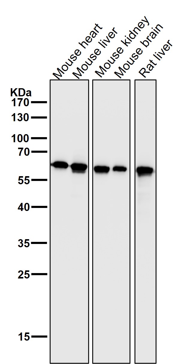 Western blot analysis of Hsp60 expression in (1) HeLa cell lysate; (2) 293T cell lysate; (3) NIH/3T3 cell lysate; (4) Mouse heart lysate; (5) PC-12 cell lysate; (6) Rat heart lysate.