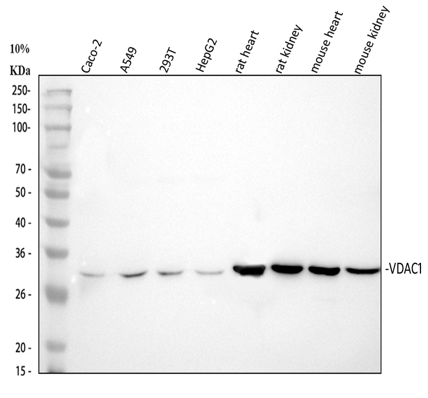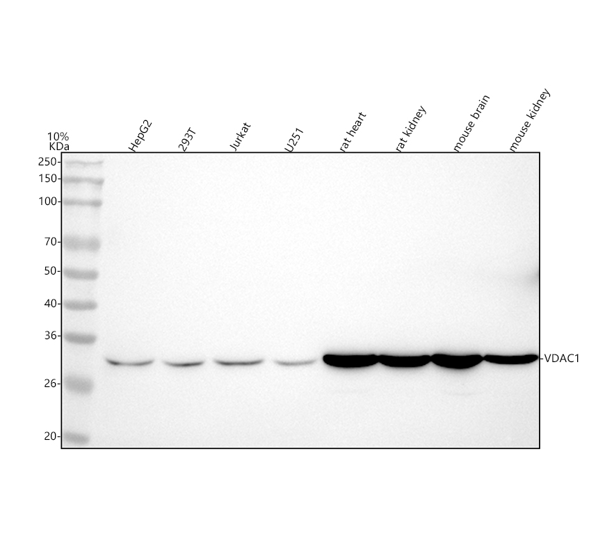Western blot analysis of anti-VDAC1 antibody (BM4279). The sample well of each lane was loaded with 30 ug of sample under reducing conditions.