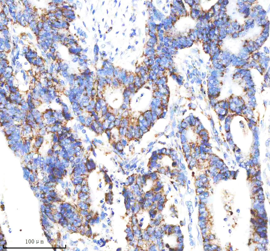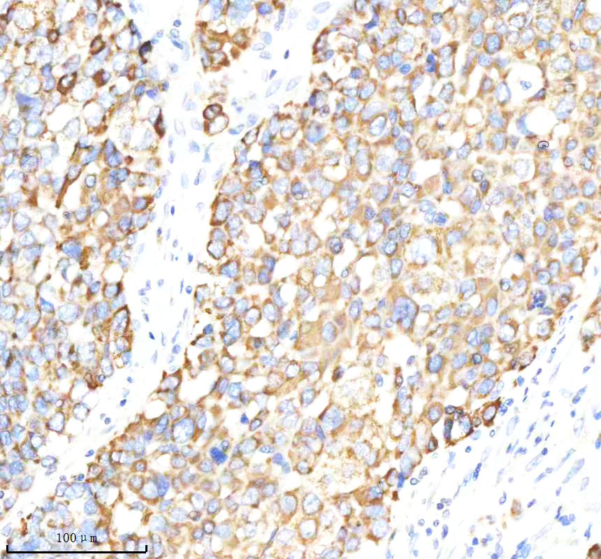 VDAC1 was detected in a paraffin-embedded section of human stomach cancer tissue. The tissue section was incubated with rabbit anti-VDAC1 Antibody (BM4279) at a dilution of 1:200 and developed using HRP Conjugated Rabbit IgG Super Vision Assay Kit (Catalog # SV0002) with DAB (Catalog # AR1027) as the chromogen.
