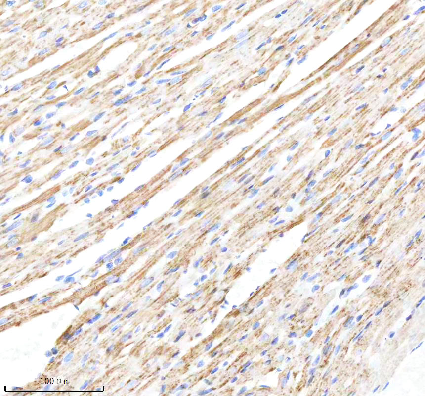 VDAC1 was detected in a paraffin-embedded section of rat heart tissue. The tissue section was incubated with rabbit anti-VDAC1 Antibody (BM4279) at a dilution of 1:200 and developed using HRP Conjugated Rabbit IgG Super Vision Assay Kit (Catalog # SV0002) with DAB (Catalog # AR1027) as the chromogen.