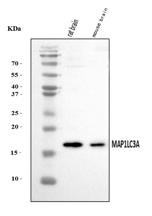 Western blot analysis of anti-LC3A/MAP1LC3A antibody (BM4367). The sample well of each lane was loaded with 30 ug of sample under reducing conditions.