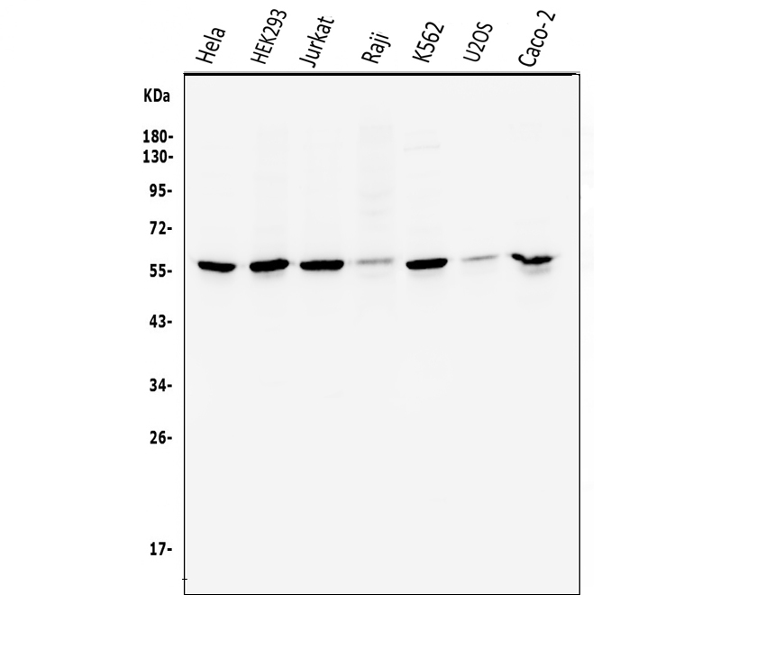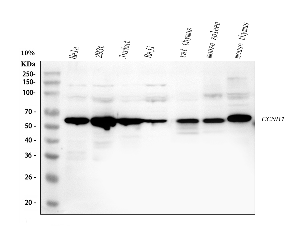 Western blot analysis of anti-Cyclin B1/CCNB1 antibody (BM4370). The sample well of each lane was loaded with 30 ug of sample under reducing conditions.