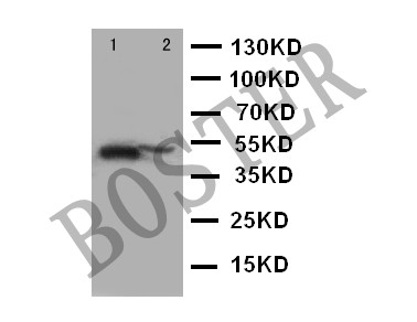 After electrophoresis, proteins were transferred to a membrane. Then the membrane was incubated with rabbit anti-Cyclin B1/CCNB1 antigen affinity purified monoclonal antibody (BM4370) and probed with a goat anti-rabbit IgG-HRP secondary antibody (Catalog # BA1054). The signal is developed using ECL Plus Western Blotting Substrate (Catalog # AR1197). A specific band was detected for Cyclin B1/CCNB1 at approximately 55 kDa. The expected band size for Cyclin B1/CCNB1 is at 48 kDa.