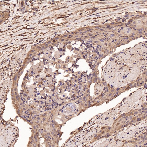 Immunohistochemical analysis of paraffin-embedded Human esophageal carcinoma, using the Antibody at 1:500 dilution.