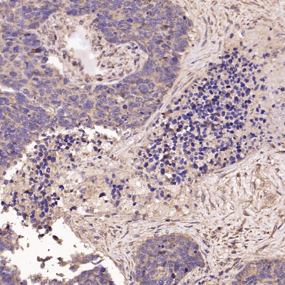 Immunohistochemical analysis of paraffin-embedded Human lung large cell cancer, using the Antibody at 1:100 dilution.