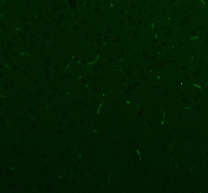 Nestin/NES was detected in a paraffin-embedded section of rat brain tissue. The tissue section was incubated with rabbit anti-Nestin/NES Antibody (BM4494) at a dilution of 1:100. Fluoro488-conjugated Anti-rabbit IgG Secondary Antibody (green) (Catalog # BA1127) was used as secondary antibody.