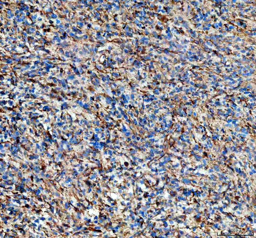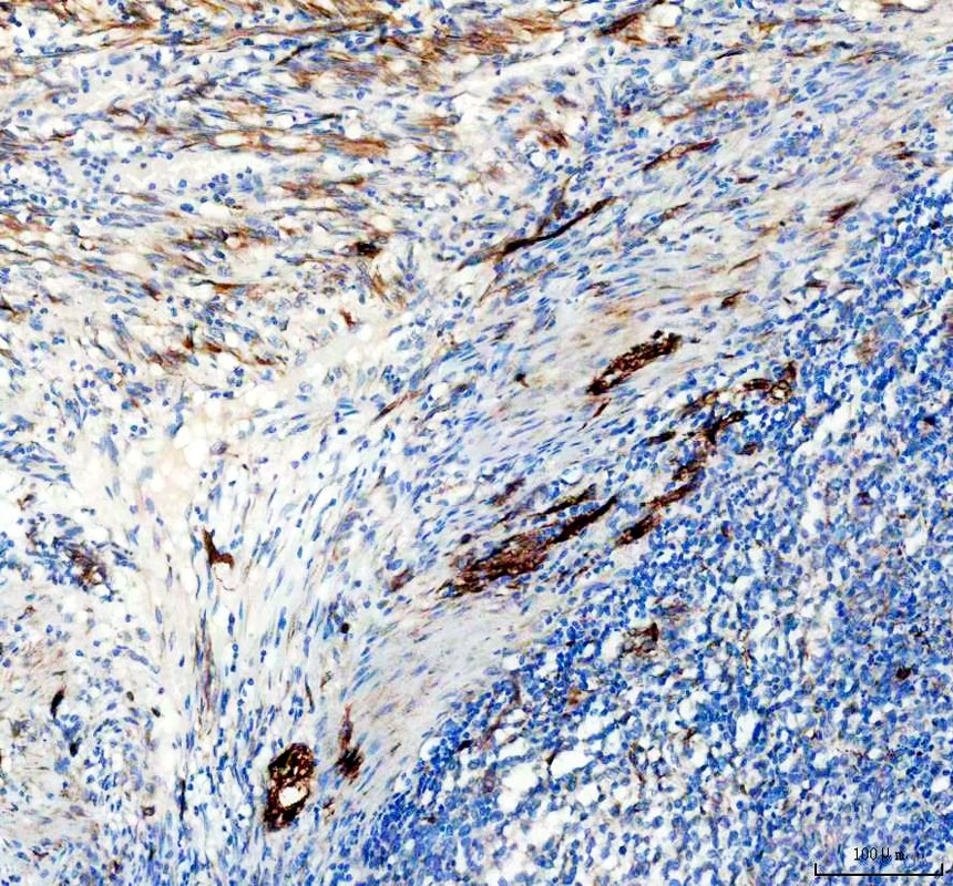 Nestin/NES was detected in a paraffin-embedded section of human Diffuse large B-cell lymphoma of the intestine tissue. The tissue section was incubated with rabbit anti-Nestin/NES Antibody (BM4494) at a dilution of 1:200 and developed using HRP Conjugated Rabbit IgG Super Vision Assay Kit (Catalog # SV0002) with DAB (Catalog # AR1027) as the chromogen.