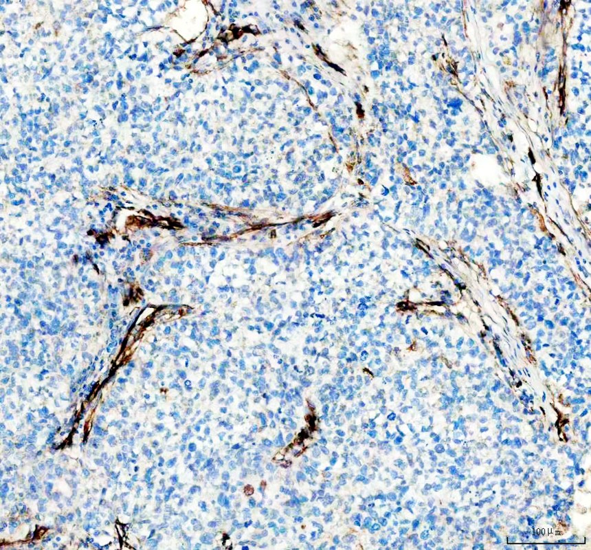 Nestin/NES was detected in a paraffin-embedded section of human non-small cell lung cancer tissue. The tissue section was incubated with rabbit anti-Nestin/NES Antibody (BM4494) at a dilution of 1:200 and developed using HRP Conjugated Rabbit IgG Super Vision Assay Kit (Catalog # SV0002) with DAB (Catalog # AR1027) as the chromogen.