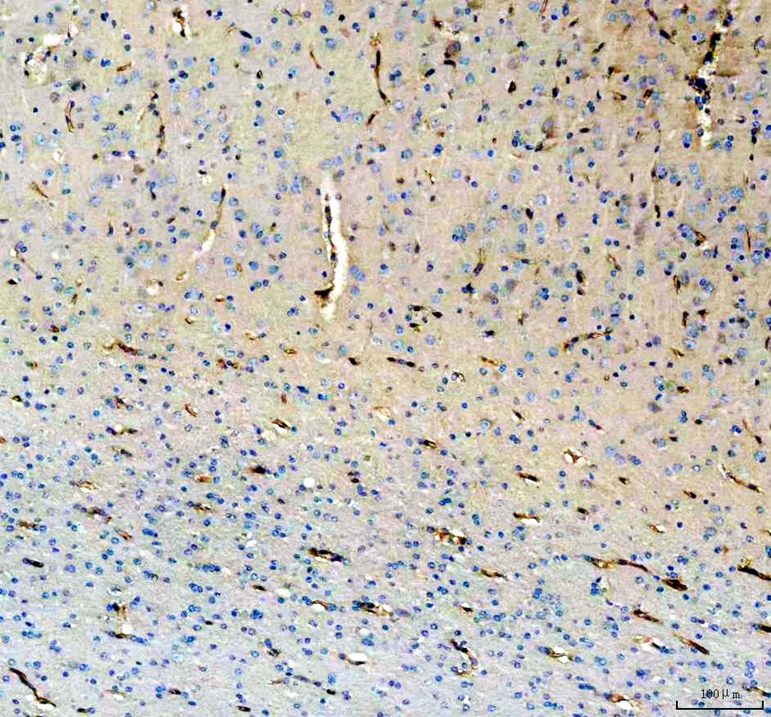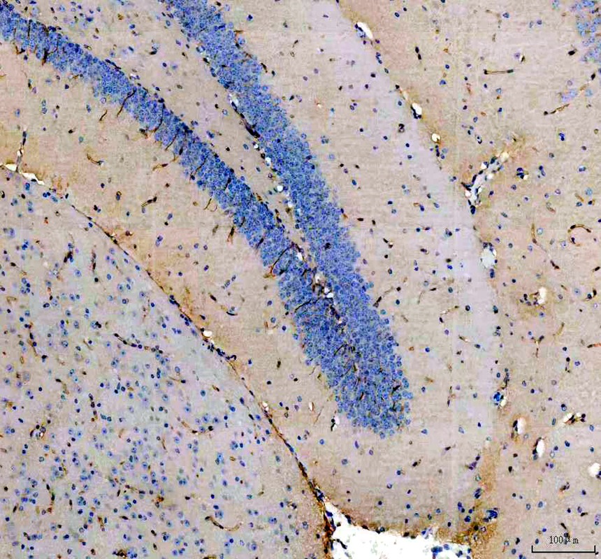 Nestin/NES was detected in a paraffin-embedded section of mouse brain tissue. The tissue section was incubated with rabbit anti-Nestin/NES Antibody (BM4494) at a dilution of 1:200 and developed using HRP Conjugated Rabbit IgG Super Vision Assay Kit (Catalog # SV0002) with DAB (Catalog # AR1027) as the chromogen.
