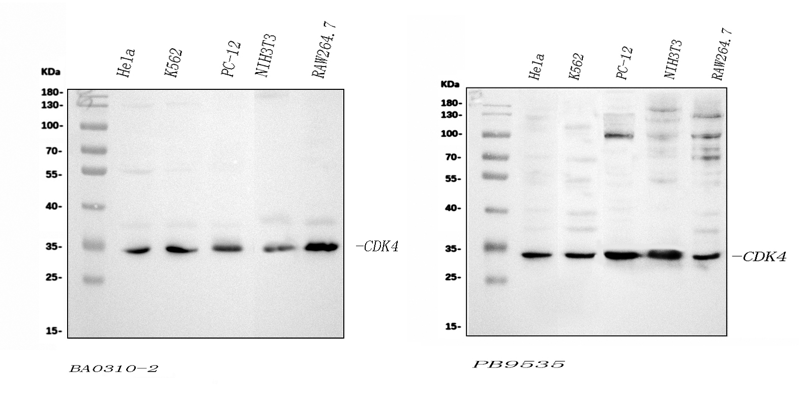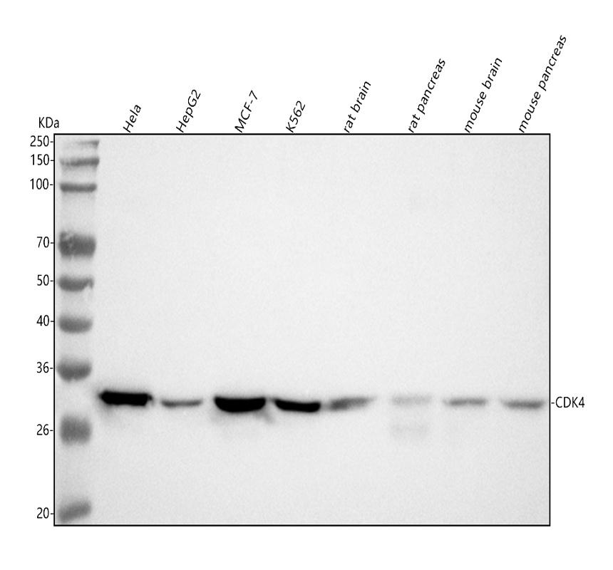 Western blot analysis of anti-CDK4 antibody (BM4672). The sample well of each lane was loaded with 30 ug of sample under reducing conditions.