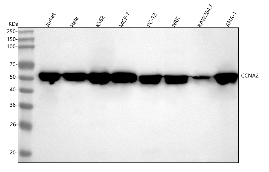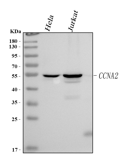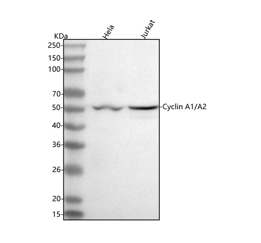 Western blot analysis of anti-Cyclin A2/CCNA2 antibody (BM4673). The sample well of each lane was loaded with 30 ug of sample under reducing conditions.
