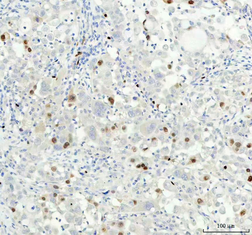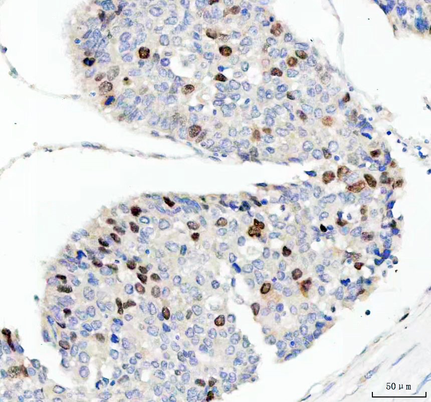 Cyclin A2/CCNA2 was detected in a paraffin-embedded section of human lung cancer tissue. The tissue section was incubated with rabbit anti-Cyclin A2/CCNA2 Antibody (BM4673) at a dilution of 1:200 and developed using HRP Conjugated Rabbit IgG Super Vision Assay Kit (Catalog # SV0002) with DAB (Catalog # AR1027) as the chromogen.