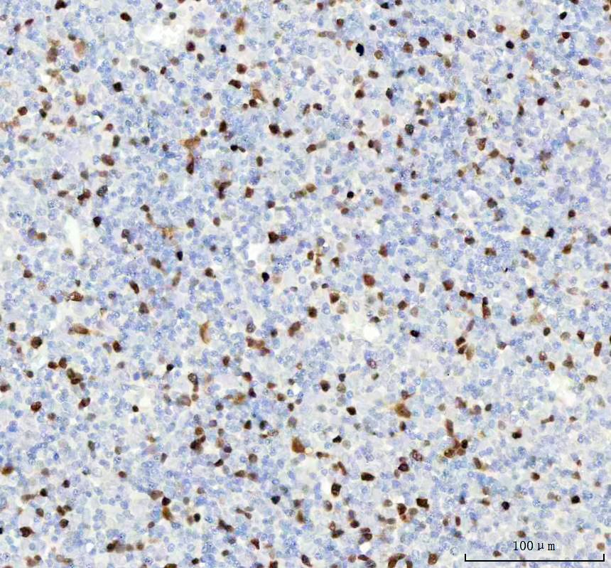 Cyclin A2/CCNA2 was detected in a paraffin-embedded section of human spleen tissue. The tissue section was incubated with rabbit anti-Cyclin A2/CCNA2 Antibody (BM4673) at a dilution of 1:200 and developed using HRP Conjugated Rabbit IgG Super Vision Assay Kit (Catalog # SV0002) with DAB (Catalog # AR1027) as the chromogen.