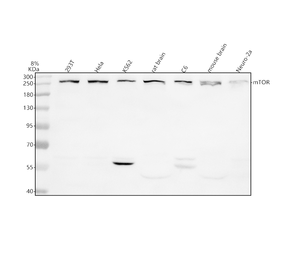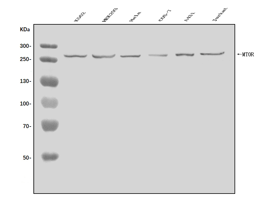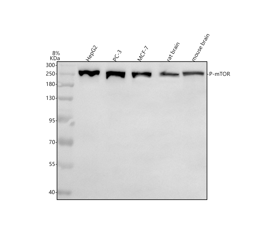 Western blot analysis of anti-mTOR (Phospho-S2448) antibody (BM4840). The sample well of each lane was loaded with 30 ug of sample under reducing conditions.