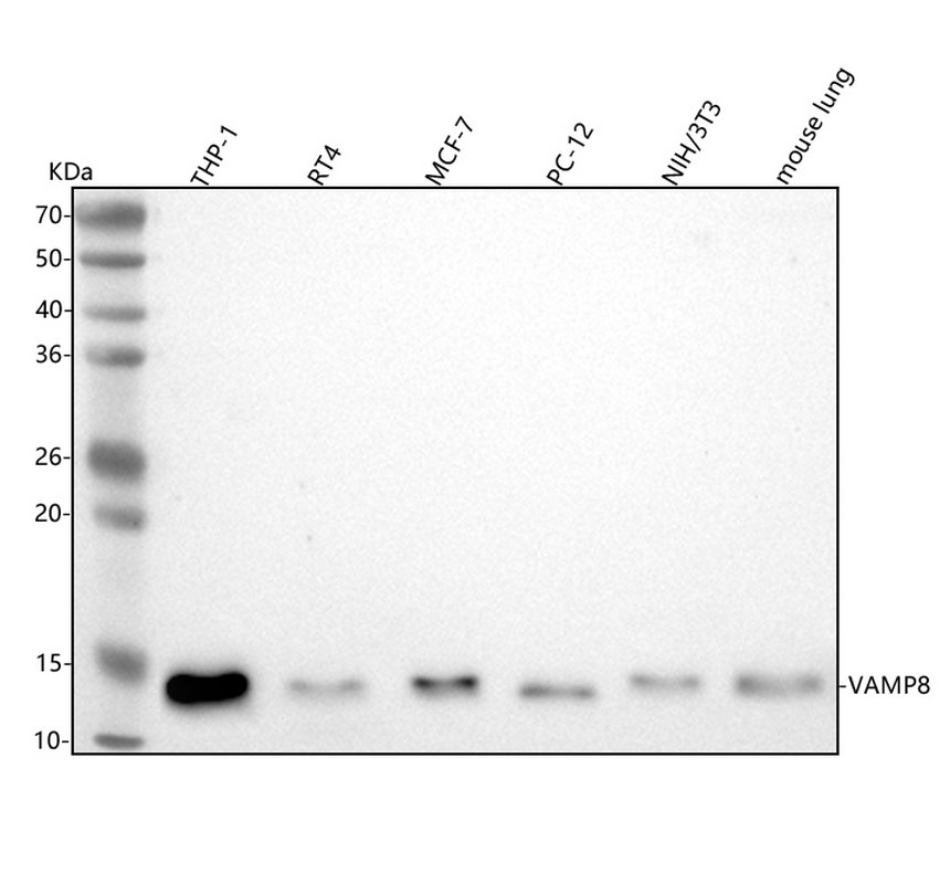 Western blot analysis of anti-VAMP8 antibody (BM4895). The sample well of each lane was loaded with 30 ug of sample under reducing conditions.
