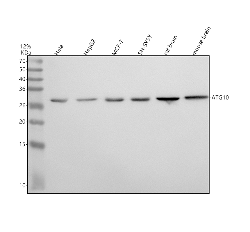 After electrophoresis, proteins were transferred to a membrane. Then the membrane was incubated with rabbit anti-ATG10 antigen affinity purified monoclonal antibody (BM5104) at a dilution of 1:1000 and probed with a goat anti-rabbit IgG-HRP secondary antibody (Catalog # BA1054). The signal is developed using ECL Plus Western Blotting Substrate (Catalog # AR1197). A specific band was detected for ATG10 at approximately 28 kDa. The expected band size for ATG10 is at 25 kDa.