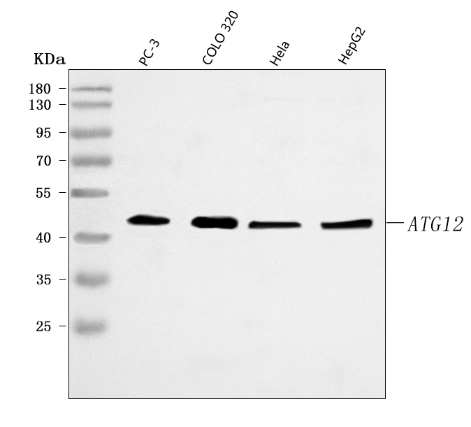 Western blot analysis of anti-ATG12 antibody (BM5176). The sample well of each lane was loaded with 30 ug of sample under reducing conditions.