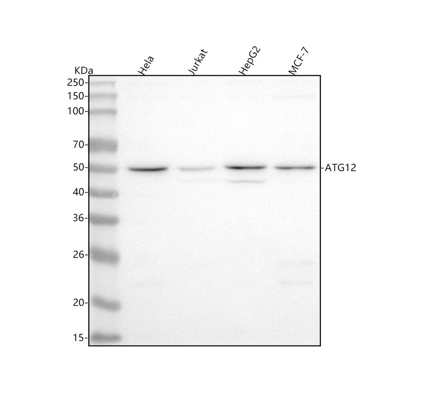 After electrophoresis, proteins were transferred to a membrane. Then the membrane was incubated with rabbit anti-ATG12 antigen affinity purified monoclonal antibody (BM5176) at a dilution of 1:1000 and probed with a goat anti-rabbit IgG-HRP secondary antibody (Catalog # BA1054). The signal is developed using ECL Plus Western Blotting Substrate (Catalog # AR1197). A specific band was detected for ATG12 at approximately 50 kDa. The expected band size for ATG12 is at 15 kDa.