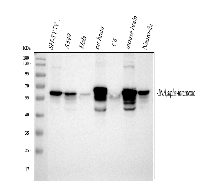 Alpha-Internexin (INA; also NF-66) is a 66 kDa member of the intermediate filament (IF) protein family. The protein was originally purified from rat optic nerve and spinal cord. And the protein copurifies with other neurofilament subunits, as it was originally discovered, however in some mature neurons it can be the only neurofilament expressed. The protein is present in developing neuroblasts and in the Central Nervous System of adults. Meanwhile, the protein is a major component of the intermediate filament network in small interneurons and cerebellar granule cells, where it is present in the parallel fibers.