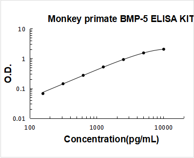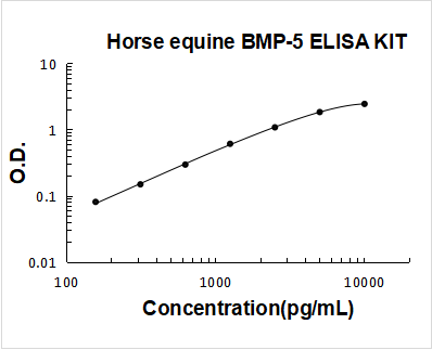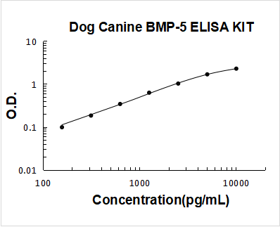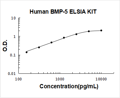 Bone morphogenetic protein 5 is a protein that in humans is encoded by the BMP5 gene.1,2,3 The protein encoded by this gene is member of the TGFbeta superfamily. Bone morphogenetic proteins are known for their ability to induce bone and cartilage development. BMP5 may play a role in certain cancers. Like other BMP's BMP5 is inhibited by chordin and noggin. It is expressed in the trabecular meshwork and optic nerve head and may have a role in the development and normal function. It is also expressed in the lung and liver. BMP-5 is mapped on Bovine chromosome 6.4 The standard used in this kit is recombinant BMP-5 with the monomer molecular mass of 18KDa.