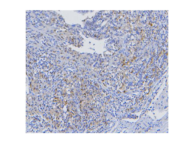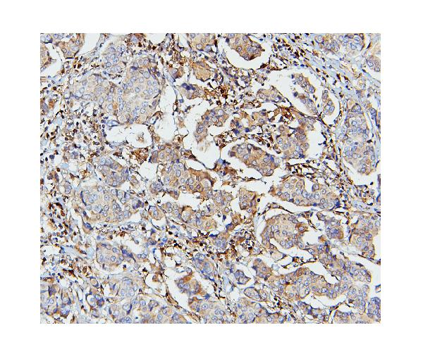 STAT1 was detected in a paraffin-embedded section of human mammary cancer tissue. Biotinylated goat anti-mouse IgG was used as secondary antibody. The tissue section was incubated with mouse anti-STAT1 Antibody (M00036-2) at a dilution of 1:200 and developed using Strepavidin-Biotin-Complex (SABC) (Catalog # SA1021) with DAB (Catalog # AR1027) as the chromogen.