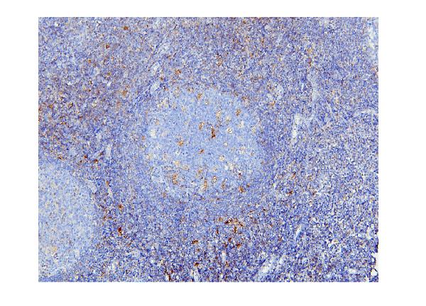 STAT1 was detected in a paraffin-embedded section of human tonsil tissue. Biotinylated goat anti-mouse IgG was used as secondary antibody. The tissue section was incubated with mouse anti-STAT1 Antibody (M00036-2) at a dilution of 1:200 and developed using Strepavidin-Biotin-Complex (SABC) (Catalog # SA1021) with DAB (Catalog # AR1027) as the chromogen.