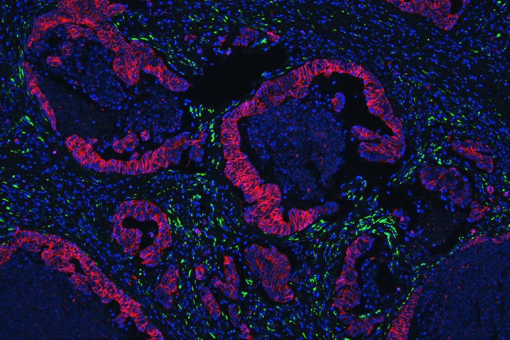 COL4A1/E Cadherin was detected in paraffin-embedded section of human colon cancer tissues. Heat mediated antigen retrieval was performed in citrate buffer (pH6, epitope retrieval solution ) for 20 mins. The tissue section was blocked with 10% goat serum. The tissue section was then incubated with 1μg/mL rabbit anti- COL4A1 Antibody (PB9099)/mouse anti E Cadherin Antibody(M00063-2) overnight at 4°C. Fluoro488 Conjugated goat anti-rabbit IgG (BA1127) /Cy3 conjugated Goat anti mouse IgG(BA1031),were used as secondary antibody at 1:100 dilution and incubated for 30 minutes at 37°C. The section was counterstained with DAPI. Visualize using a fluorescence microscope and filter sets appropriate for the label used.
