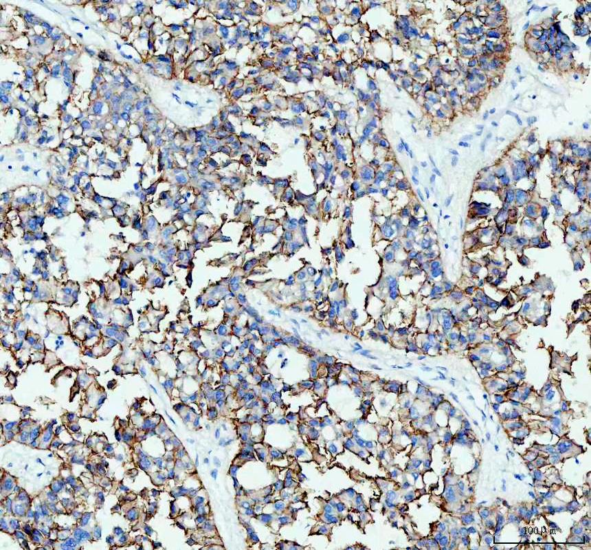 E-cadherin/CDH1 was detected in a paraffin-embedded section of human prostate cancer tissue. The tissue section was incubated with mouse anti-E-cadherin/CDH1 Antibody (M00063-2) at a dilution of 1:200 and developed using HRP Conjugated mouse IgG Super Vision Assay Kit (Catalog # SV0001) with DAB (Catalog # AR1027) as the chromogen.
