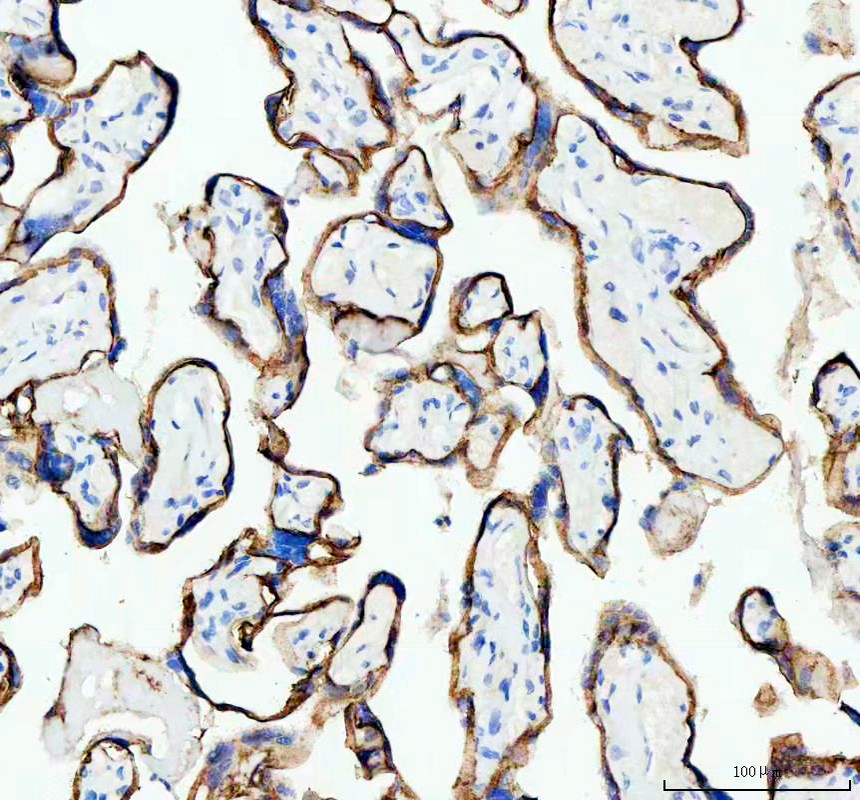 E-cadherin/CDH1 was detected in a paraffin-embedded section of human placenta tissue. The tissue section was incubated with mouse anti-E-cadherin/CDH1 Antibody (M00063-2) at a dilution of 1:200 and developed using HRP Conjugated mouse IgG Super Vision Assay Kit (Catalog # SV0001) with DAB (Catalog # AR1027) as the chromogen.